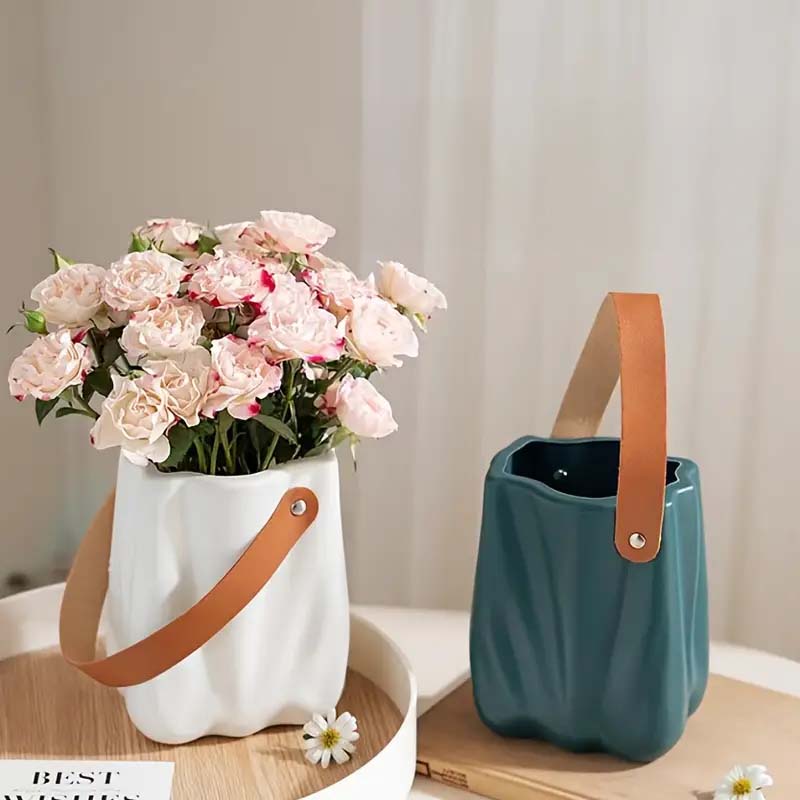 Rippled like a slow-moving current, this flower vase holds stillness in motion—soft and sculptural, yet striking. A smooth faux leather strap wraps across the body, adding warmth and contrast to its minimalist silhouette.